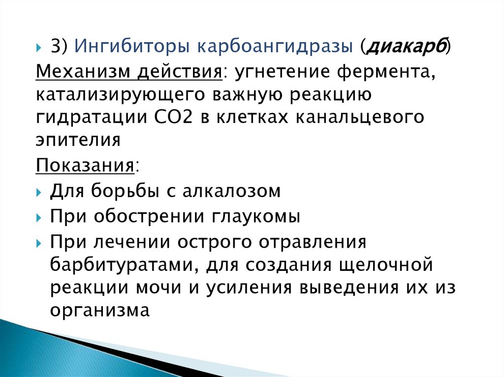3) Ингибиторы карбоангидразы (диакарб)Механизм действия: угнетение фермента,
