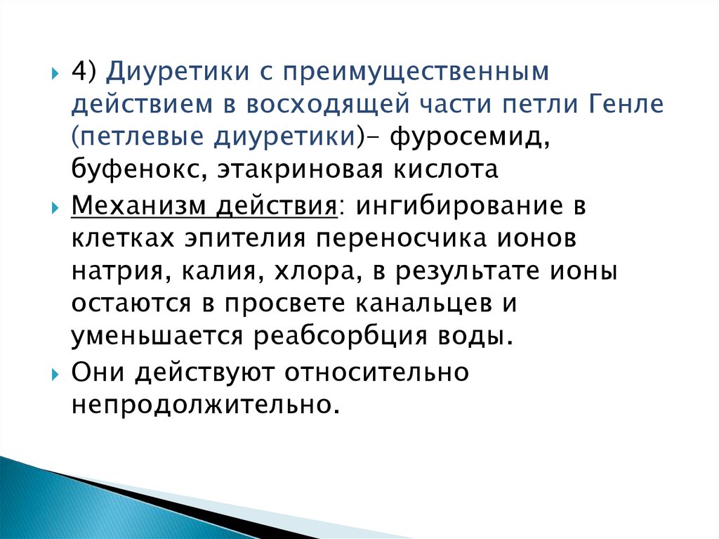 4) Диуретики с преимущественнымдействием в восходящей части петли Генле