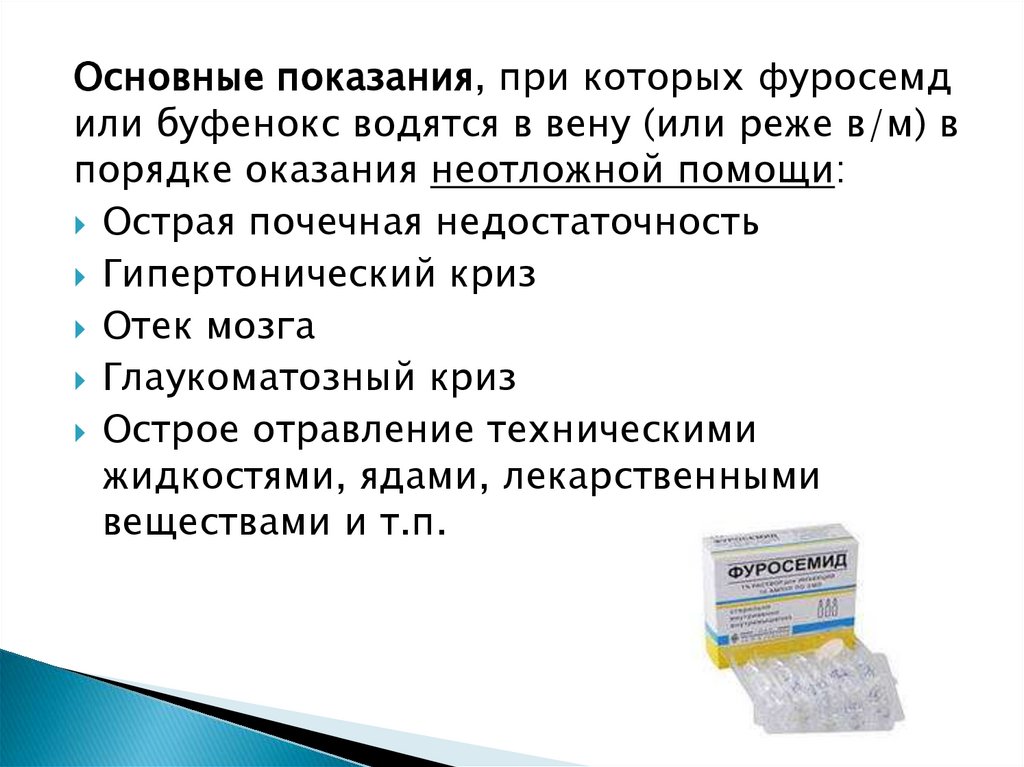 Основные показания, при которых фуросемдили буфенокс водятся в вену (или реже в/м) в
