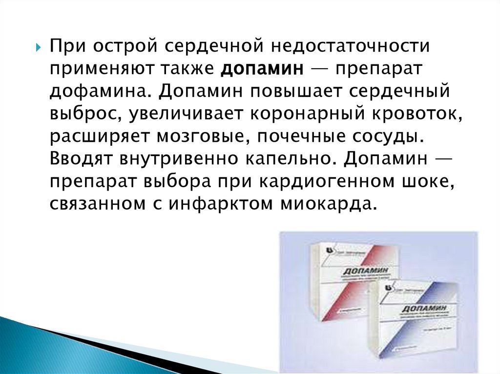 При острой сердечной недостаточностиприменяют также допамин — препарат