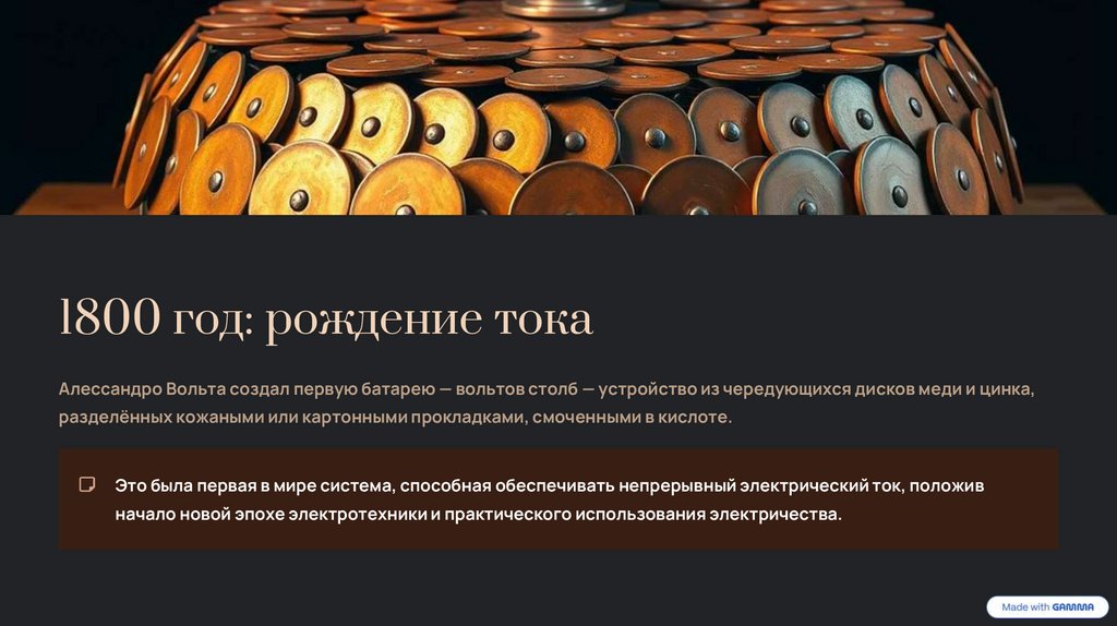 1800 год: рождение токаАлессандро Вольта создал первую батарею — вольтов столб — устройство из чередующихся дисков меди и цинка,