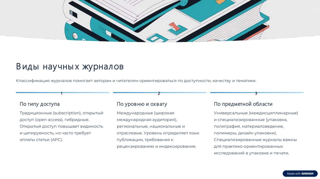 В иды научны х журналовКлассификация журналов помогает авторам и читателям ориентироваться по доступности, качеству и тематике.