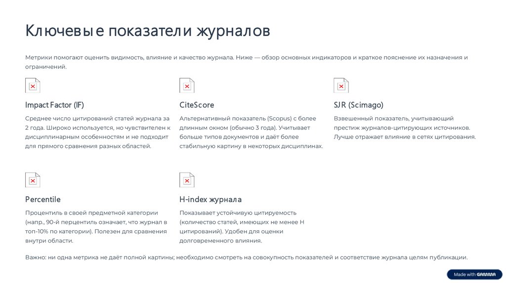 Важно: ни одна метрика не даёт полной картины; необходимо смотреть на совокупность показателей и соответствие журнала целям публикации.