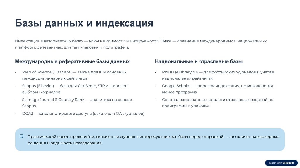 Базы данных и индексацияИндексация в авторитетных базах — ключ к видимости и цитируемости. Ниже — сравнение международных и национальных