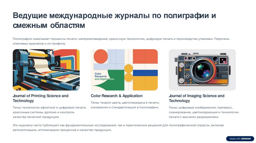 Эти журналы часто публикуют как фундаментальные исследования, так и практические решения для полиграфической отрасли, включая