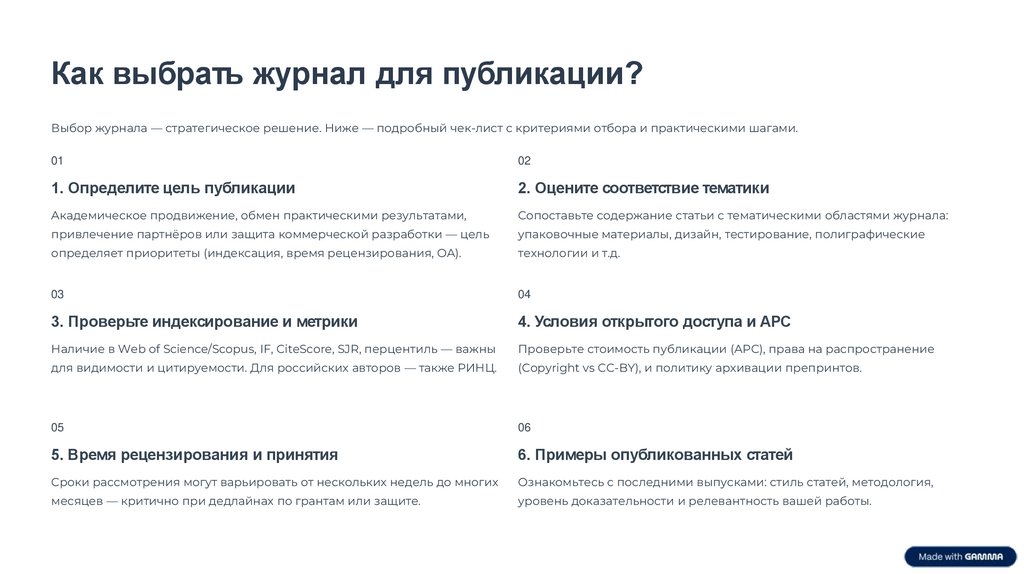 Как выбрать журнал для публикации?Выбор журнала — стратегическое решение. Ниже — подробный чек-лист с критериями отбора и практическими шагами.