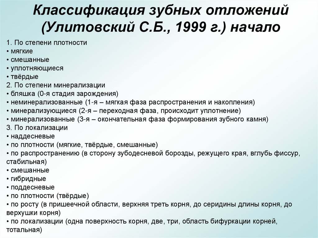 Классификация зубных отложений(Улитовский С.Б., 1999 г.) начало