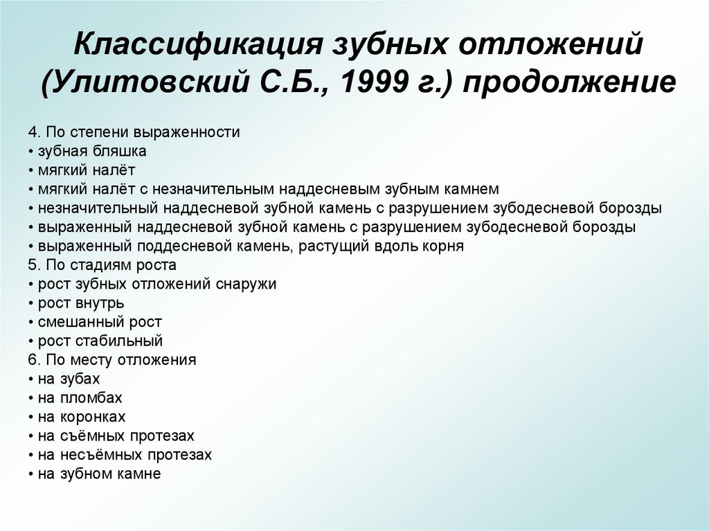 Классификация зубных отложений(Улитовский С.Б., 1999 г.) продолжение