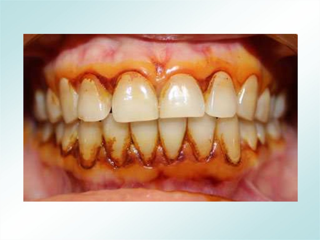 • выраженный наддесневой зубной камень с разрушением зубодесневой борозды