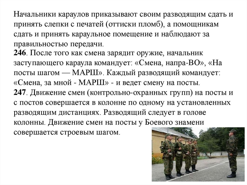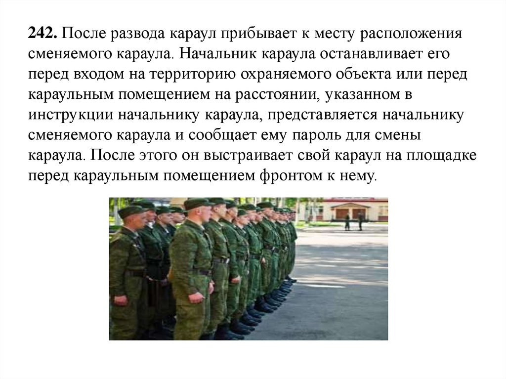 242. После развода караул прибывает к месту расположениясменяемого караула. Начальник караула останавливает его