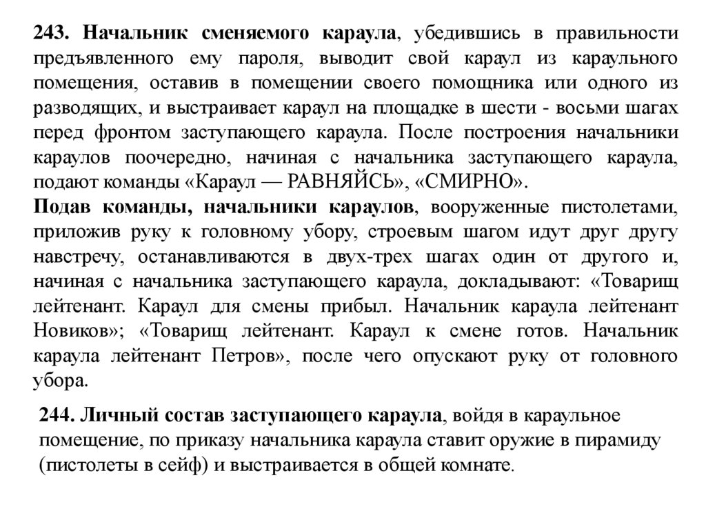 243. Начальник сменяемого караула, убедившись в правильностипредъявленного ему пароля, выводит свой караул из караульного