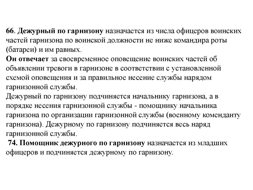 66. Дежурный по гарнизону назначается из числа офицеров воинскихчастей гарнизона по воинской должности не ниже командира роты