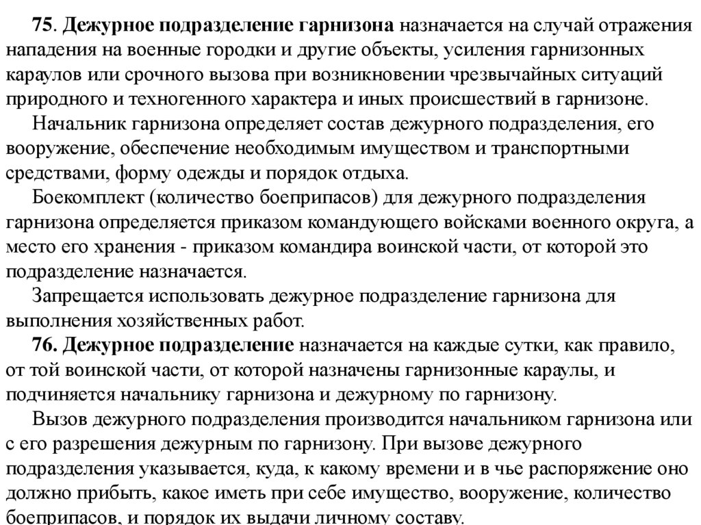 75. Дежурное подразделение гарнизона назначается на случай отражениянападения на военные городки и другие объекты, усиления гарнизонных