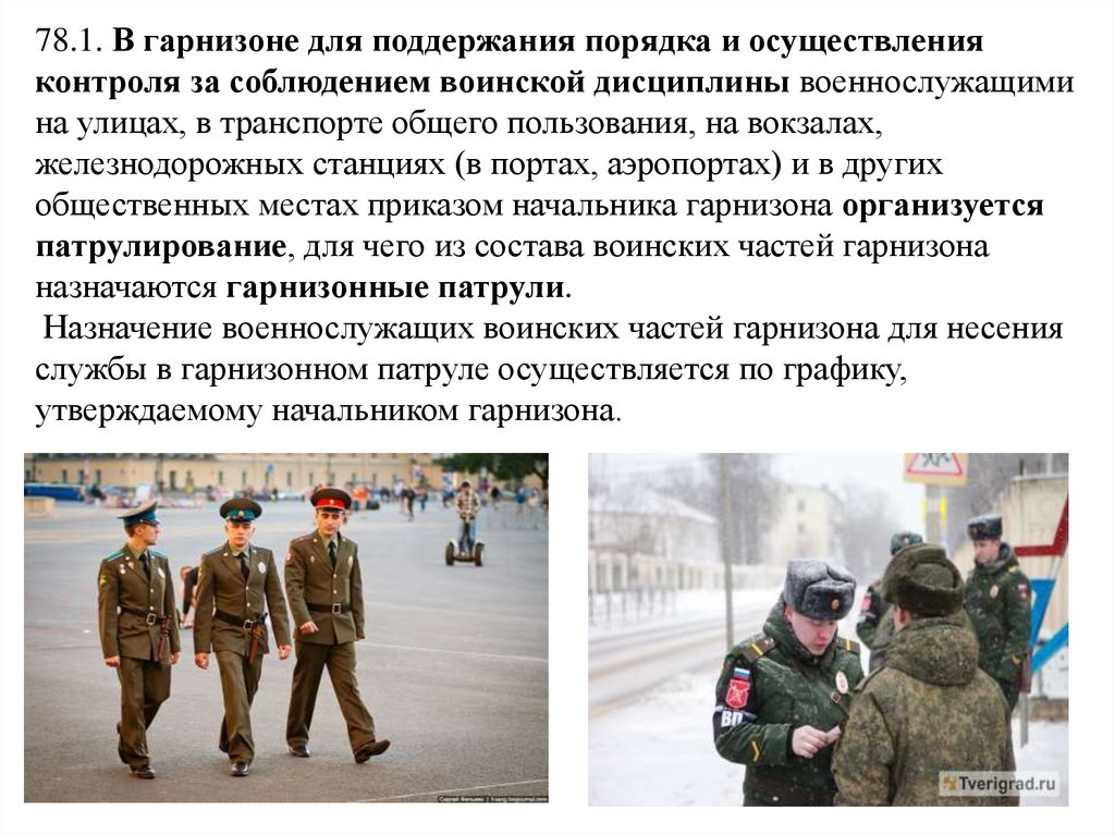 78.1. В гарнизоне для поддержания порядка и осуществленияконтроля за соблюдением воинской дисциплины военнослужащими