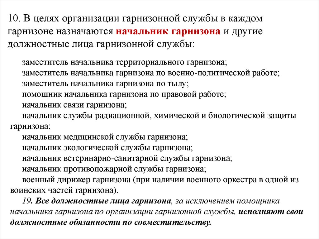 10. В целях организации гарнизонной службы в каждомгарнизоне назначаются начальник гарнизона и другие