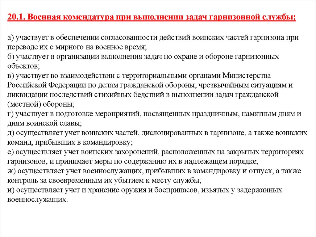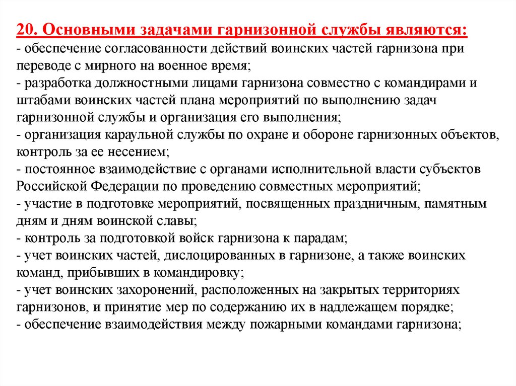 20. Основными задачами гарнизонной службы являются:- обеспечение согласованности действий воинских частей гарнизона при