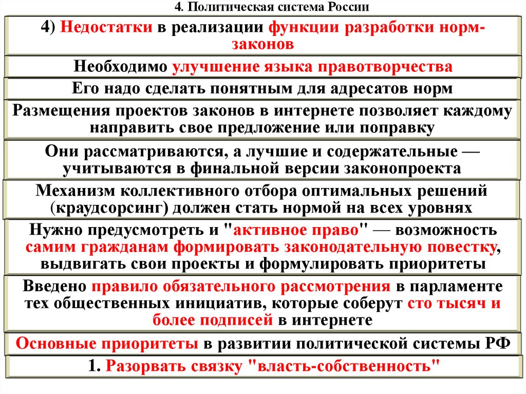 4. Политическая система России4) Недостатки в реализации функции разработки нормзаконов