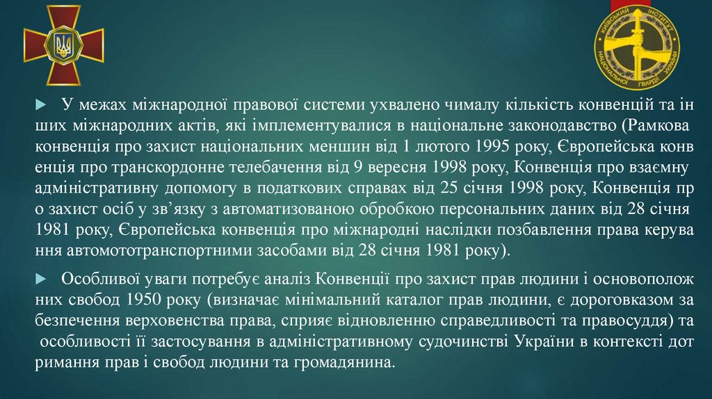 У межах міжнародної правової системи ухвалено чималу кількість конвенцій та інших міжнародних актів, які імплементувалися в національне законодавство (Рамкова