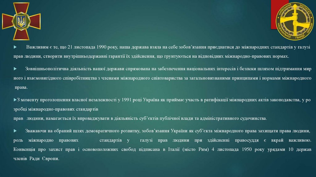Важливим є те, що 21 листопада 1990 року, наша держава взяла на себе зобов’язання приєднатися до міжнародних стандартів у галузіправ людини, створити внутрішньодержавні гарантії їх здійснення, що грунтуються на відповідних міжнародно-правових нормах.