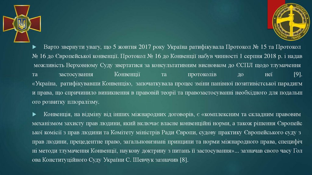 Варто звернути увагу, що 5 жовтня 2017 року Україна ратифікувала Протокол № 15 та Протокол№ 16 до Європейської конвенції. Протокол № 16 до Конвенції набув чинності 1 серпня 2018 р. і надав