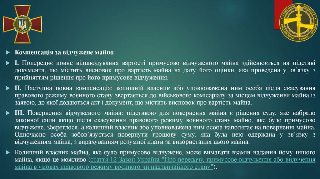 Компенсація за відчужене майноI. Попереднє повне відшкодування вартості примусово відчуженого майна здійснюється на підставі