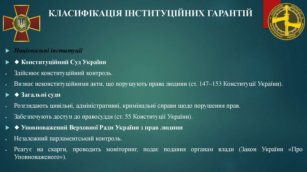 КЛАСИФІКАЦІЯ ІНСТИТУЦІЙНИХ ГАРАНТІЙНаціональні інституції