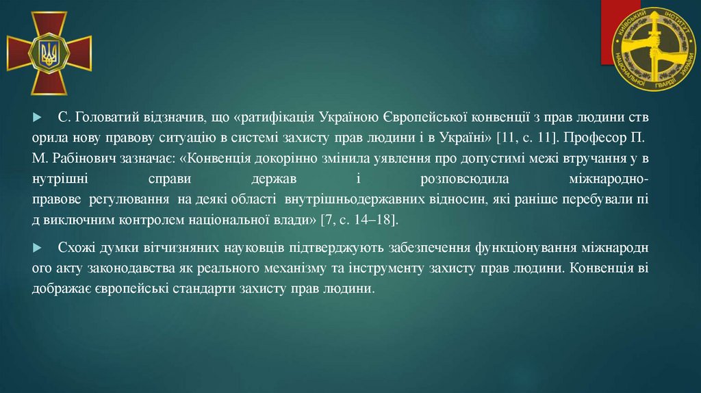 С. Головатий відзначив, що «ратифікація Україною Європейської конвенції з прав людини створила нову правову ситуацію в системі захисту прав людини і в Україні» [11, c. 11]. Професор П.
