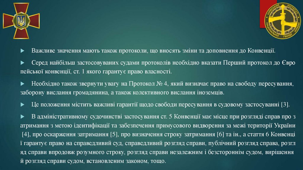 Важливе значення мають також протоколи, що вносять зміни та доповнення до Конвенції.Серед найбільш застосовуваних судами протоколів необхідно вказати Перший протокол до Євро