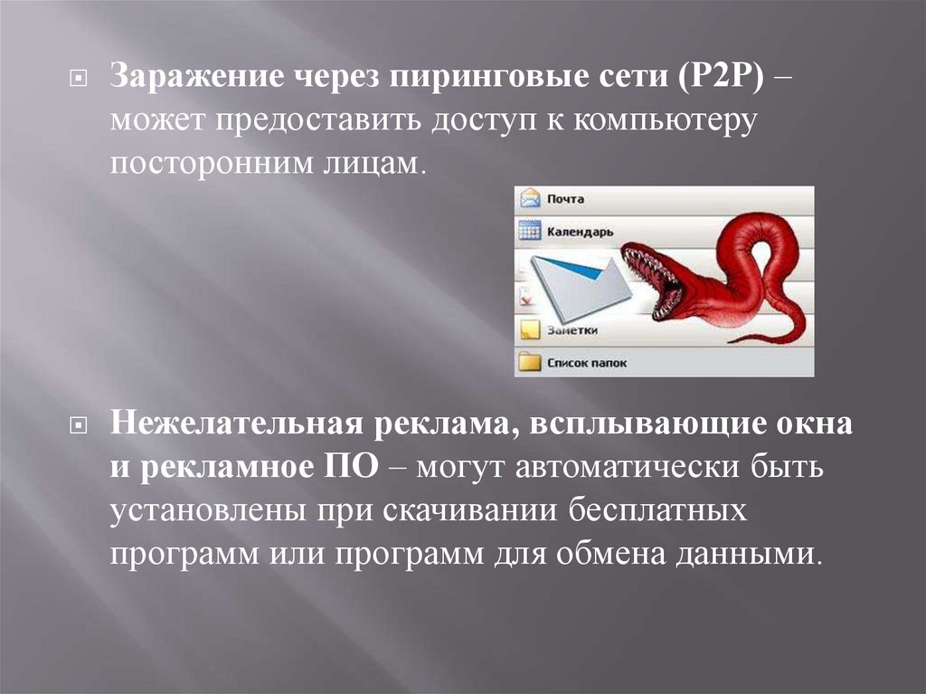 Заражение через пиринговые сети (P2P) –может предоставить доступ к компьютеру