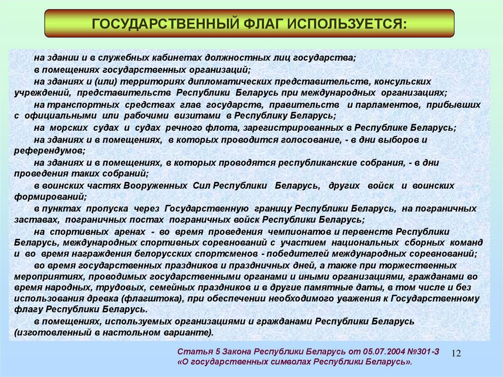 ГОСУДАРСТВЕННЫЙ ФЛАГ ИСПОЛЬЗУЕТСЯ:на здании и в служебных кабинетах должностных лиц государства;