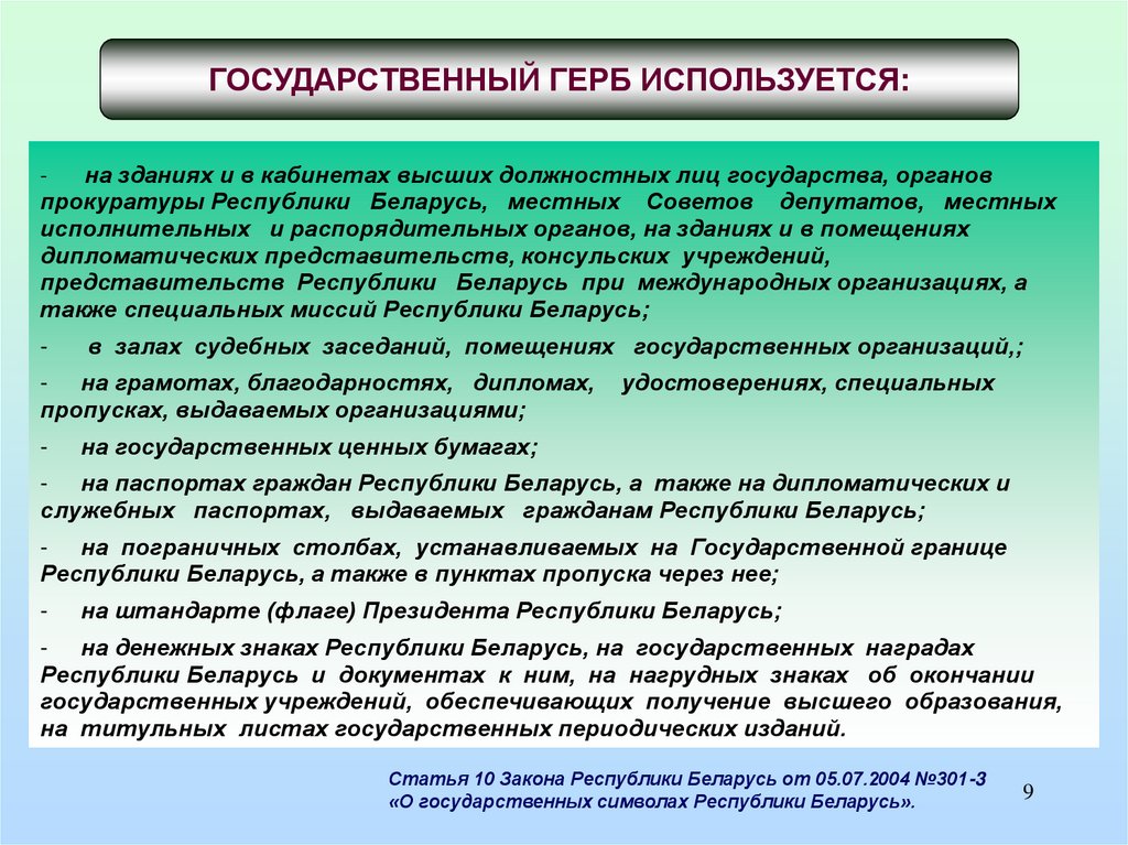 10. ИСПОЛЬЗОВАНИЕ ГОСУДАРСТВЕННОГО ГЕРБА