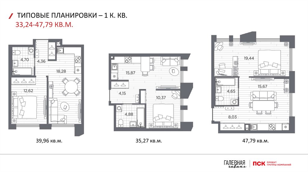 ТИПОВЫЕ ПЛАНИРОВКИ – 1 К. КВ.33,24-47,79 КВ.М.
