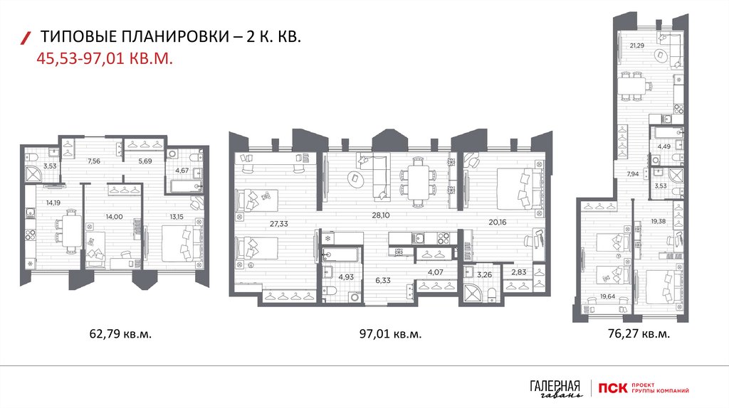 ТИПОВЫЕ ПЛАНИРОВКИ – 2 К. КВ.45,53-97,01 КВ.М.