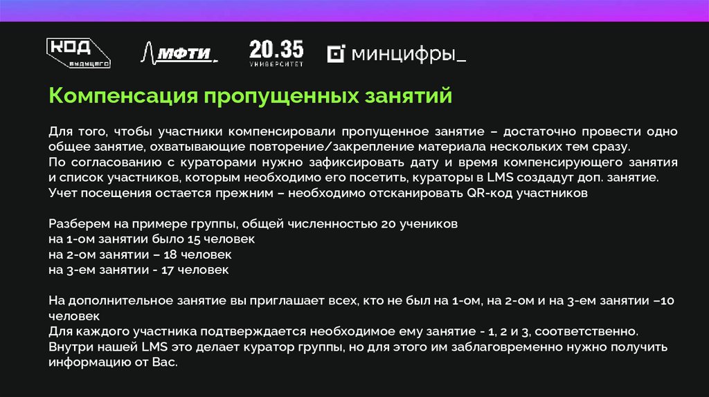 Компенсация пропущенных занятийДля того, чтобы участники компенсировали пропущенное занятие – достаточно провести одно