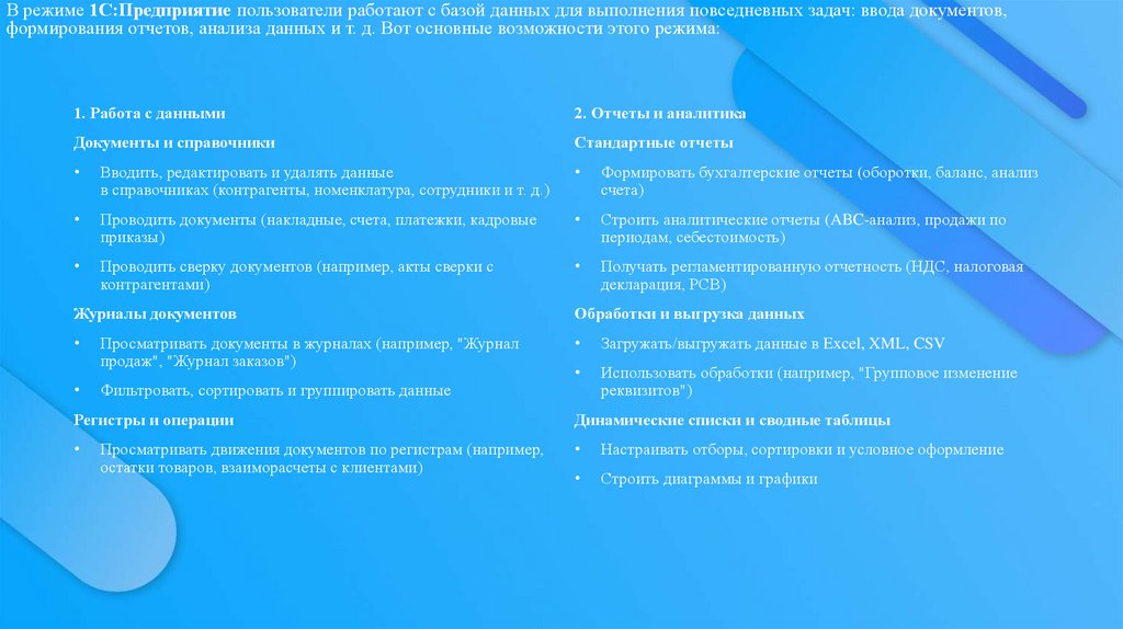 В режиме 1С:Предприятие пользователи работают с базой данных для выполнения повседневных задач: ввода документов,формирования отчетов, анализа данных и т. д. Вот основные возможности этого режима: