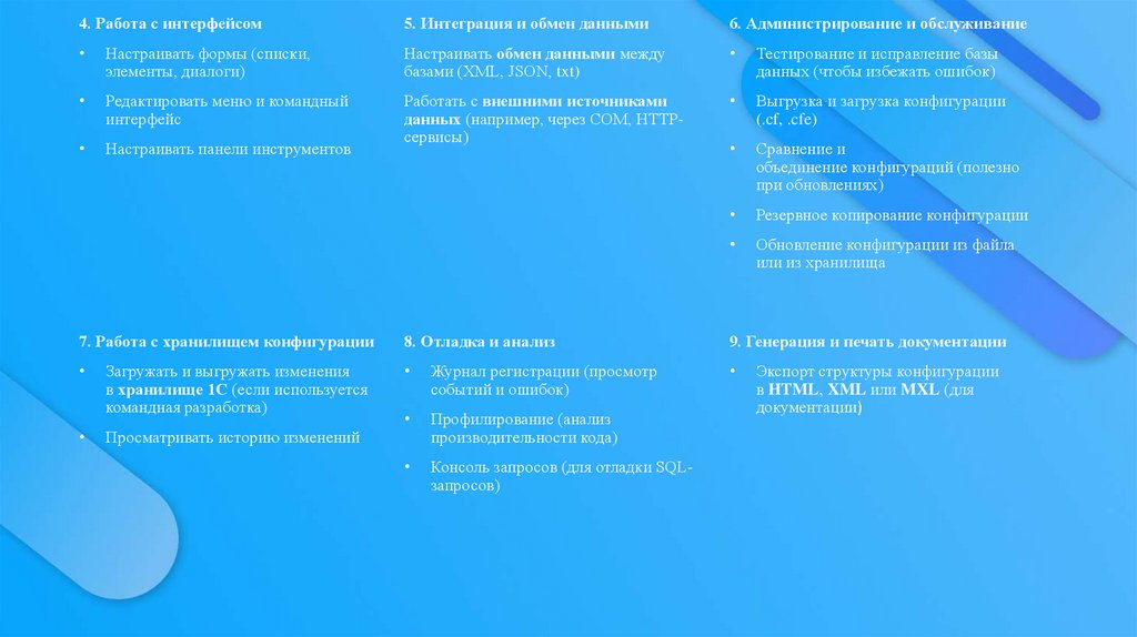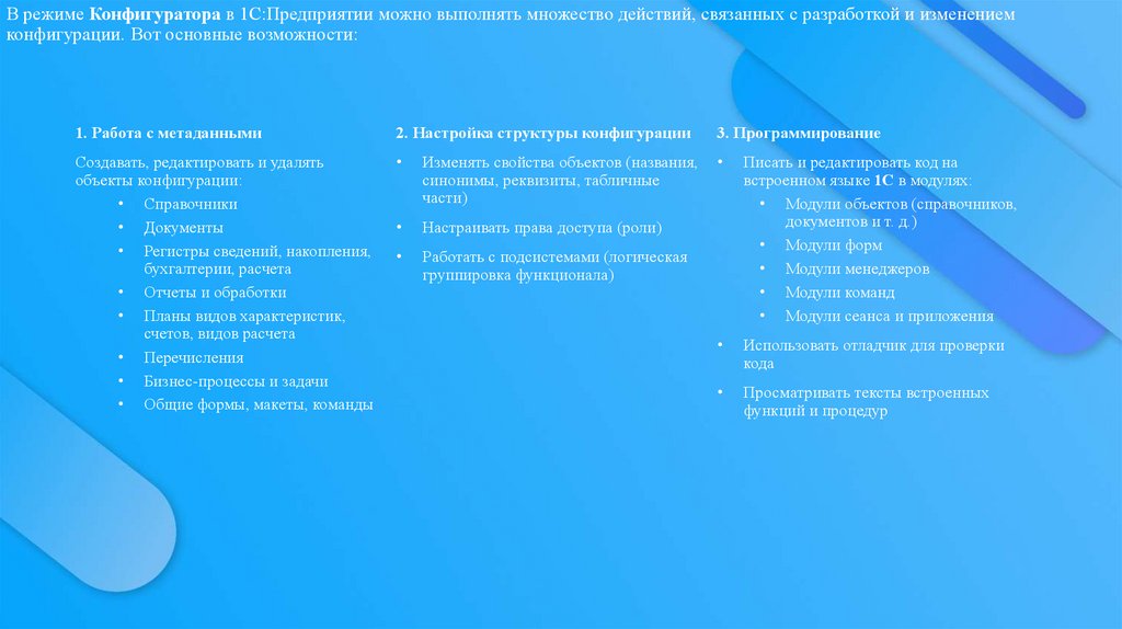 В режиме Конфигуратора в 1С:Предприятии можно выполнять множество действий, связанных с разработкой и изменениемконфигурации. Вот основные возможности:
