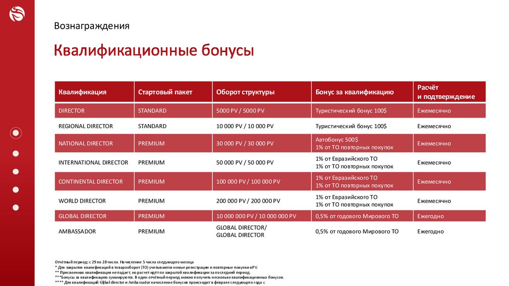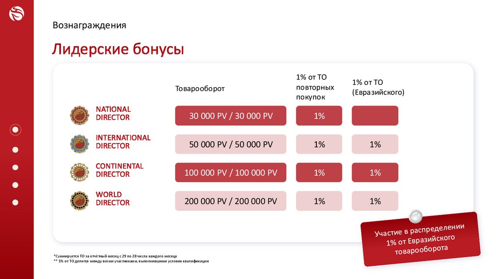 * Для закрытия квалификаций в товарооборот (ТО) учитываются новые регистрации и повторные покупки в PV.