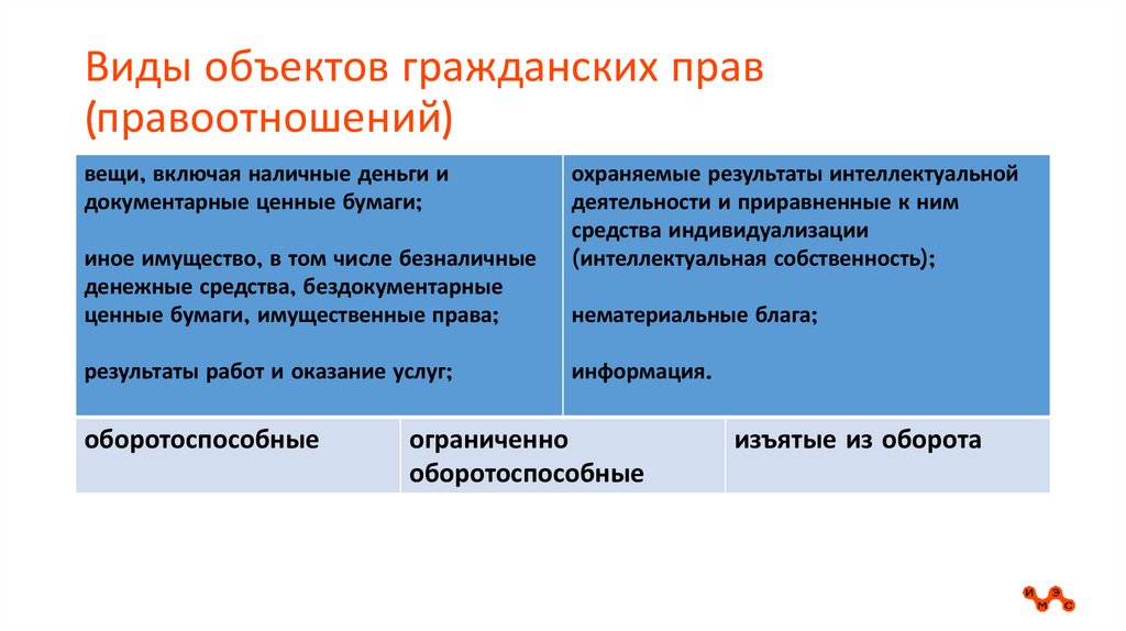 Виды объектов гражданских прав(правоотношений)