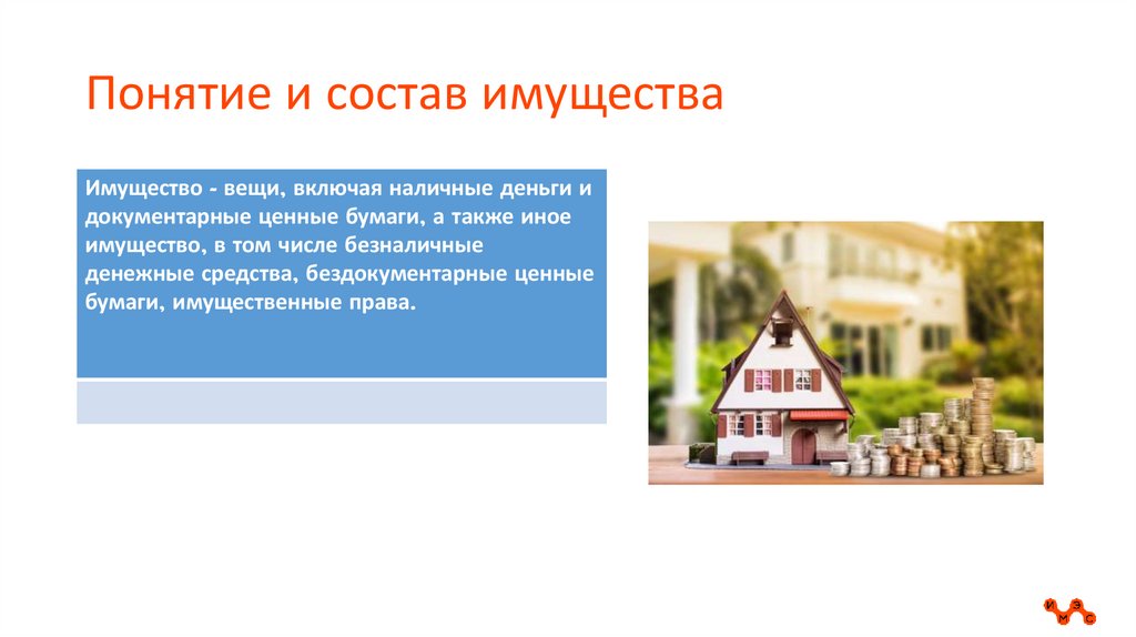 Понятие и состав имуществаИмущество - вещи, включая наличные деньги и