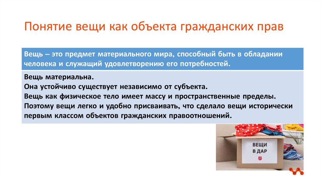 Понятие вещи как объекта гражданских правВещь – это предмет материального мира, способный быть в обладании