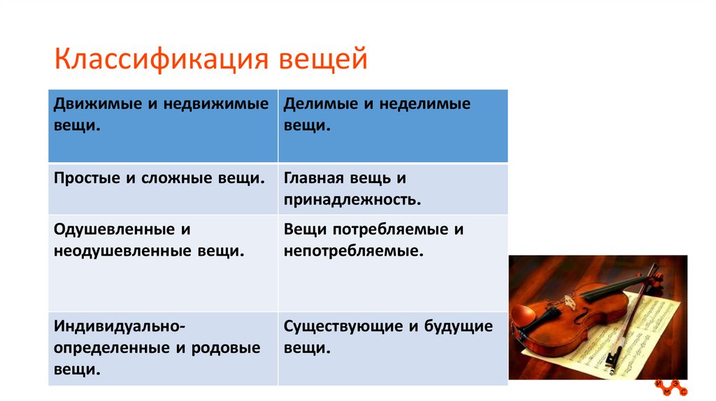 Классификация вещейДвижимые и недвижимые Делимые и неделимые