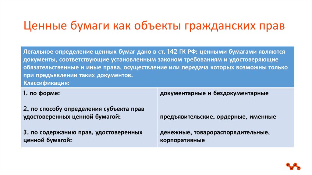 Ценные бумаги как объекты гражданских правЛегальное определение ценных бумаг дано в ст. 142 ГК РФ: ценными бумагами являются