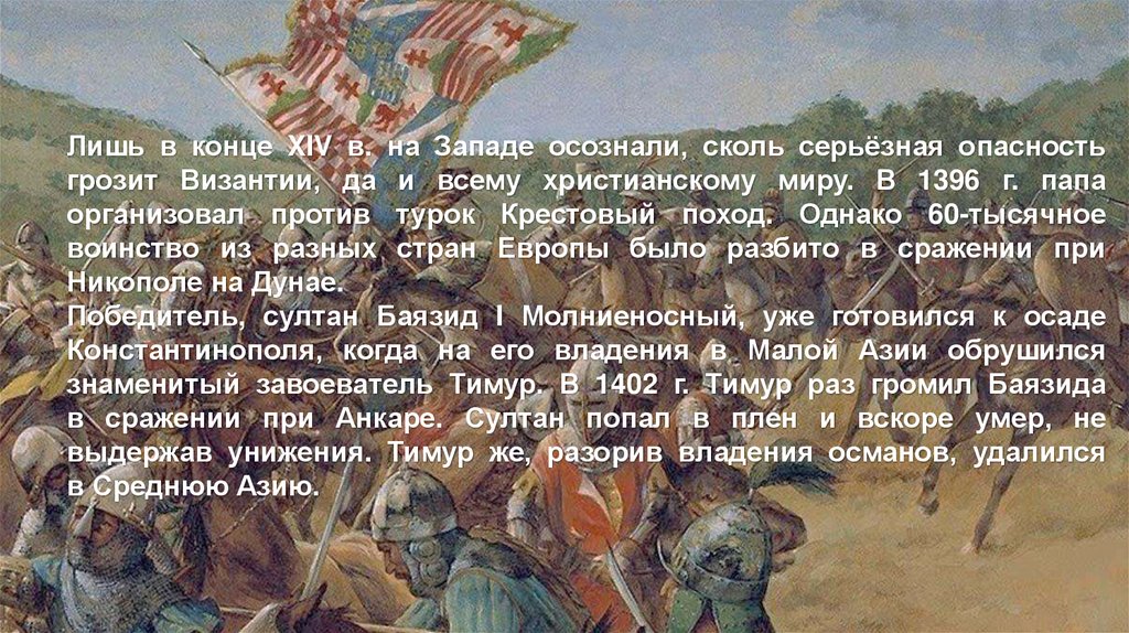 Лишь в конце XIV в. на Западе осознали, сколь серьёзная опасностьгрозит Византии, да и всему христианскому миру. В 1396 г. папа
