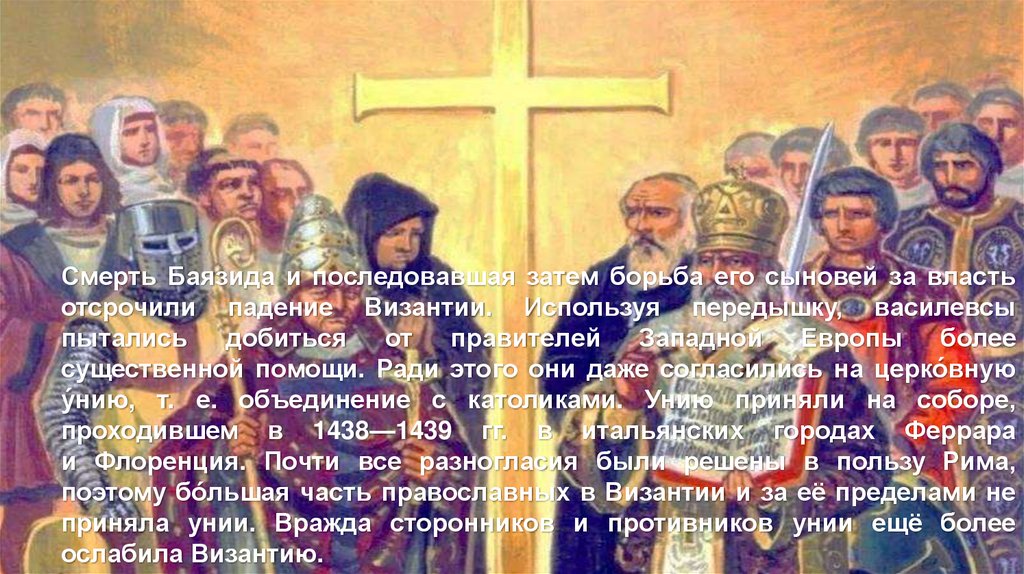 Смерть Баязида и последовавшая затем борьба его сыновей за властьотсрочили падение Византии. Используя передышку, василевсы