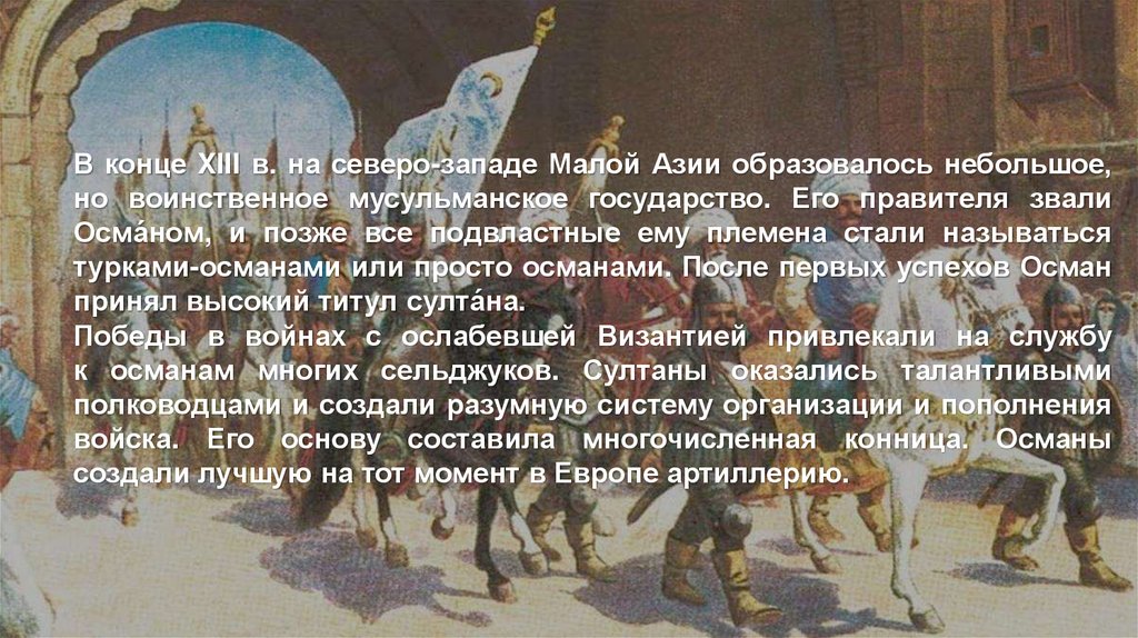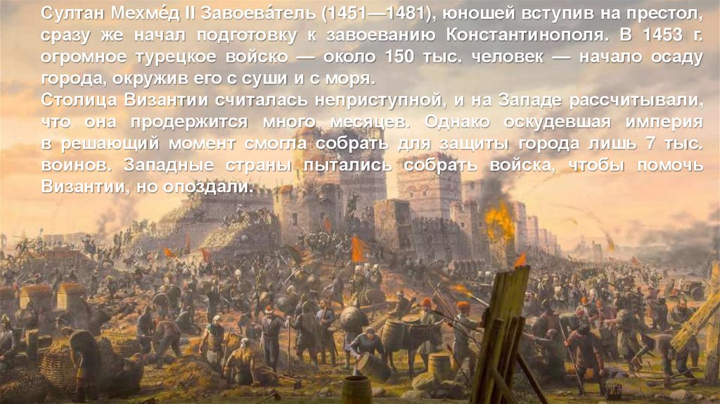 Султан Мехме́д II Завоева́тель (1451—1481), юношей вступив на престол,сразу же начал подготовку к завоеванию Константинополя. В 1453 г.
