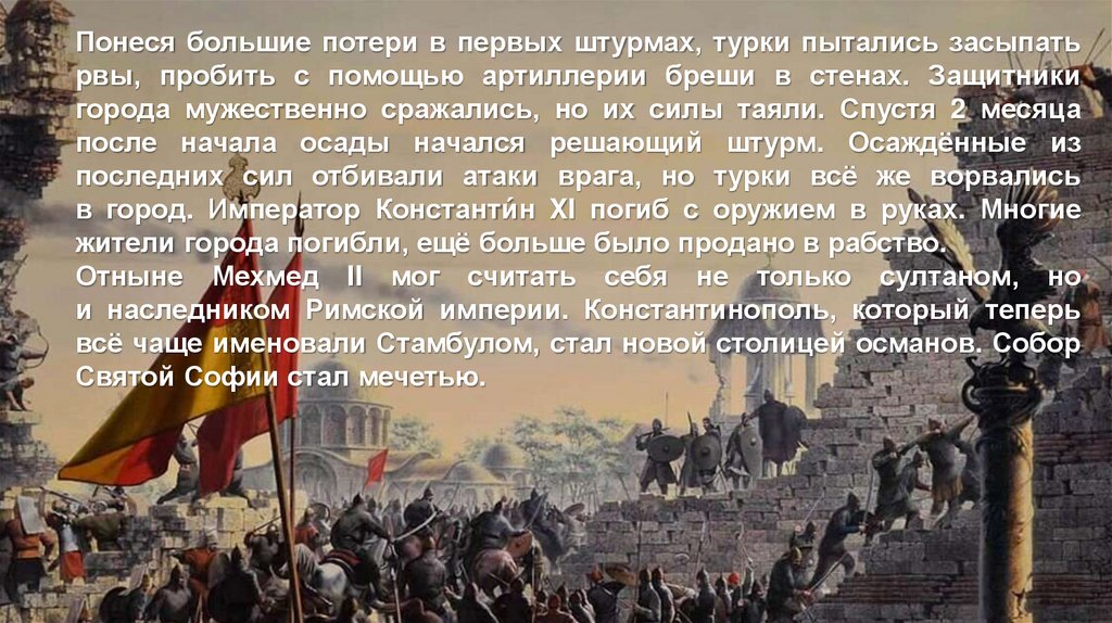 в город. Император Константи́н XI погиб с оружием в руках. Многие