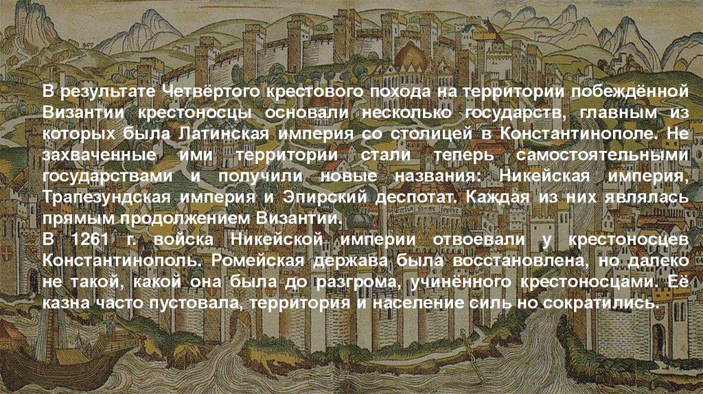 В результате Четвёртого крестового похода на территории побеждённойВизантии крестоносцы основали несколько государств, главным из