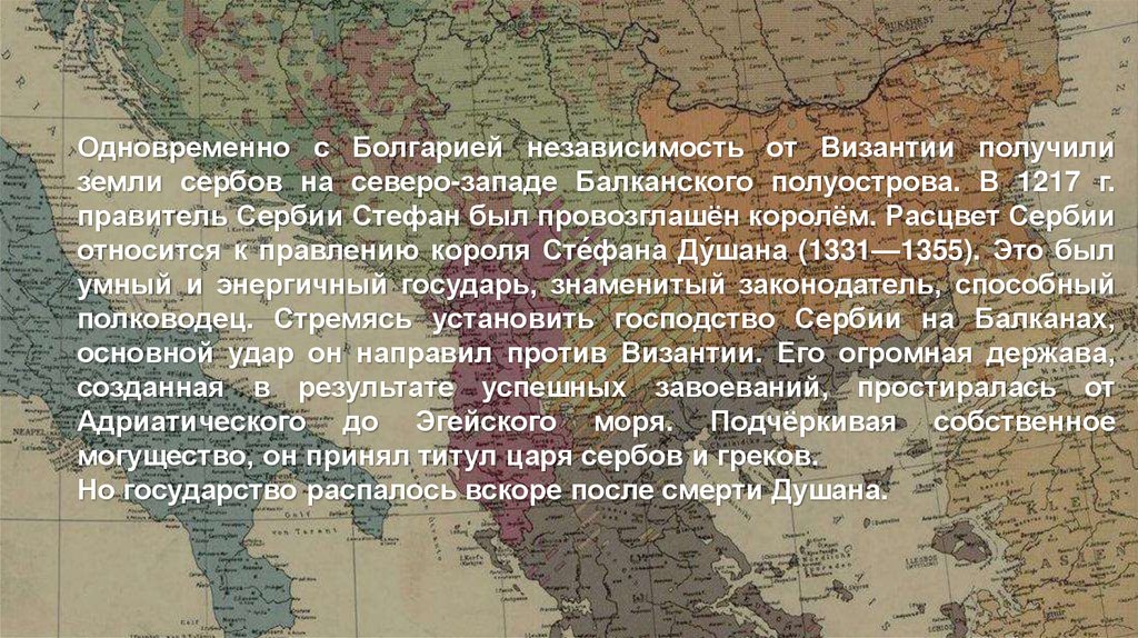 Одновременно с Болгарией независимость от Византии получилиземли сербов на северо-западе Балканского полуострова. В 1217 г.