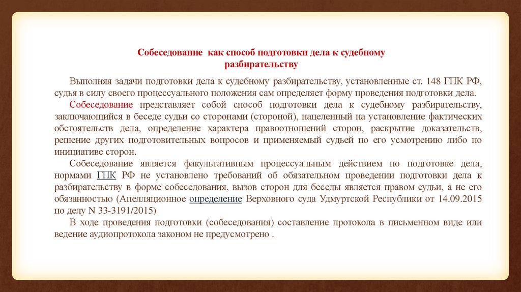 Собеседование представляет собой способ подготовки дела к судебному разбирательству,