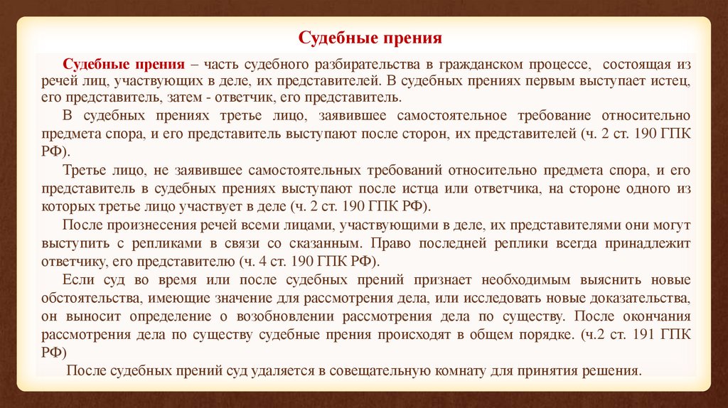 Судебные пренияСудебные прения – часть судебного разбирательства в гражданском процессе, состоящая из